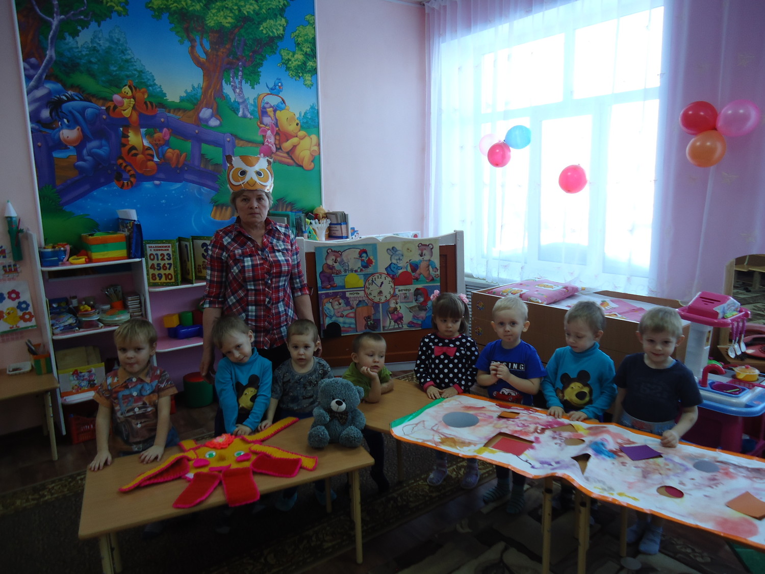 • «Паровоз», шапочка совы, обручи (синего и зелёных цветов), бумажные ковер и набор геометрических фигур для его украшений, надувной шарик, плакат частей суток, мягкие модули, кубики, шарики.