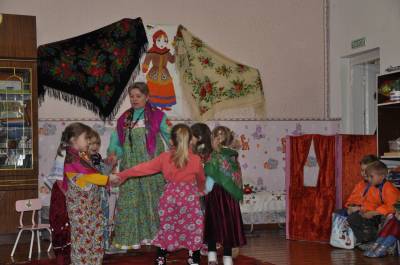 стены. Музыкальный руководитель надевает на себя накидку и платок.
