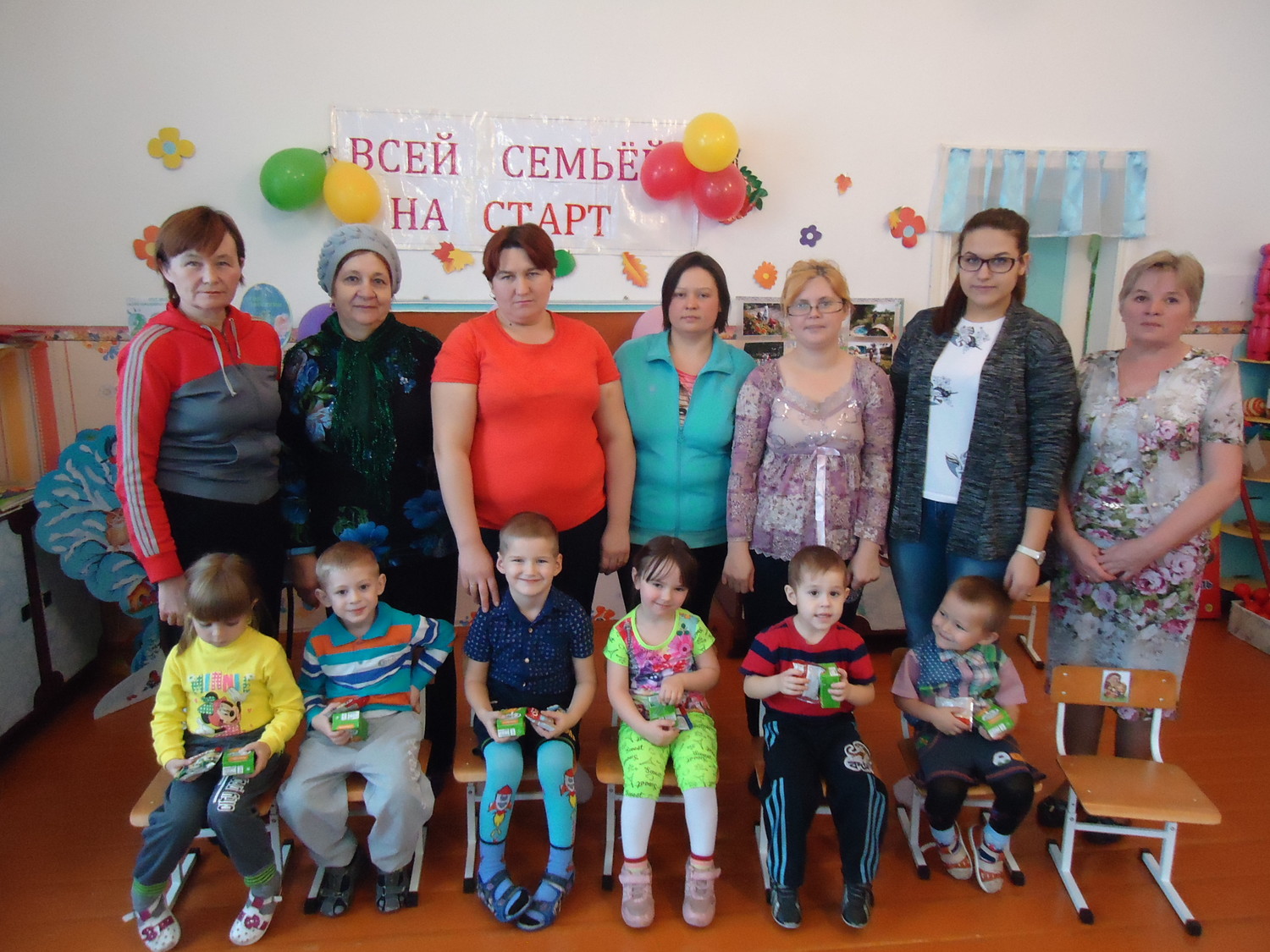 Дети и родители сидят на стульчиках