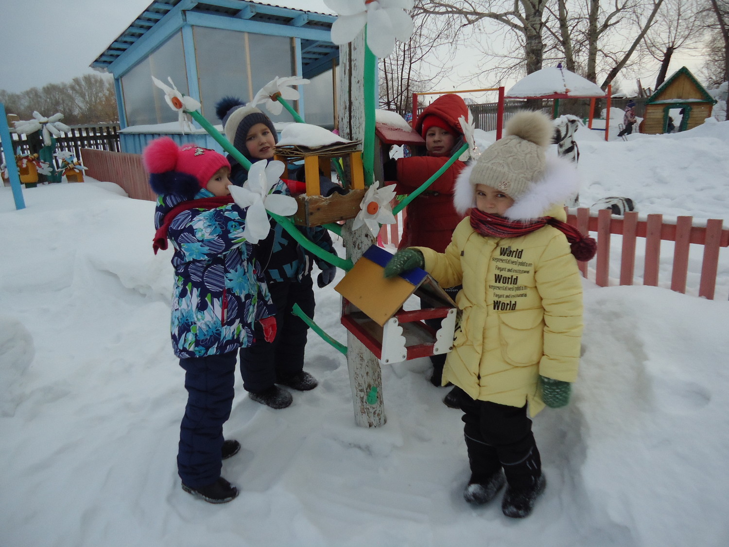 Кормушки мы с детьми разместили на участке детского сада. Ребята с удовольствием развешивали птичьи столовые, а после каждый день, выходя на прогулку, спешат подсыпать корм для пернатых. Теперь дети точно знают, что птички не останутся голодными