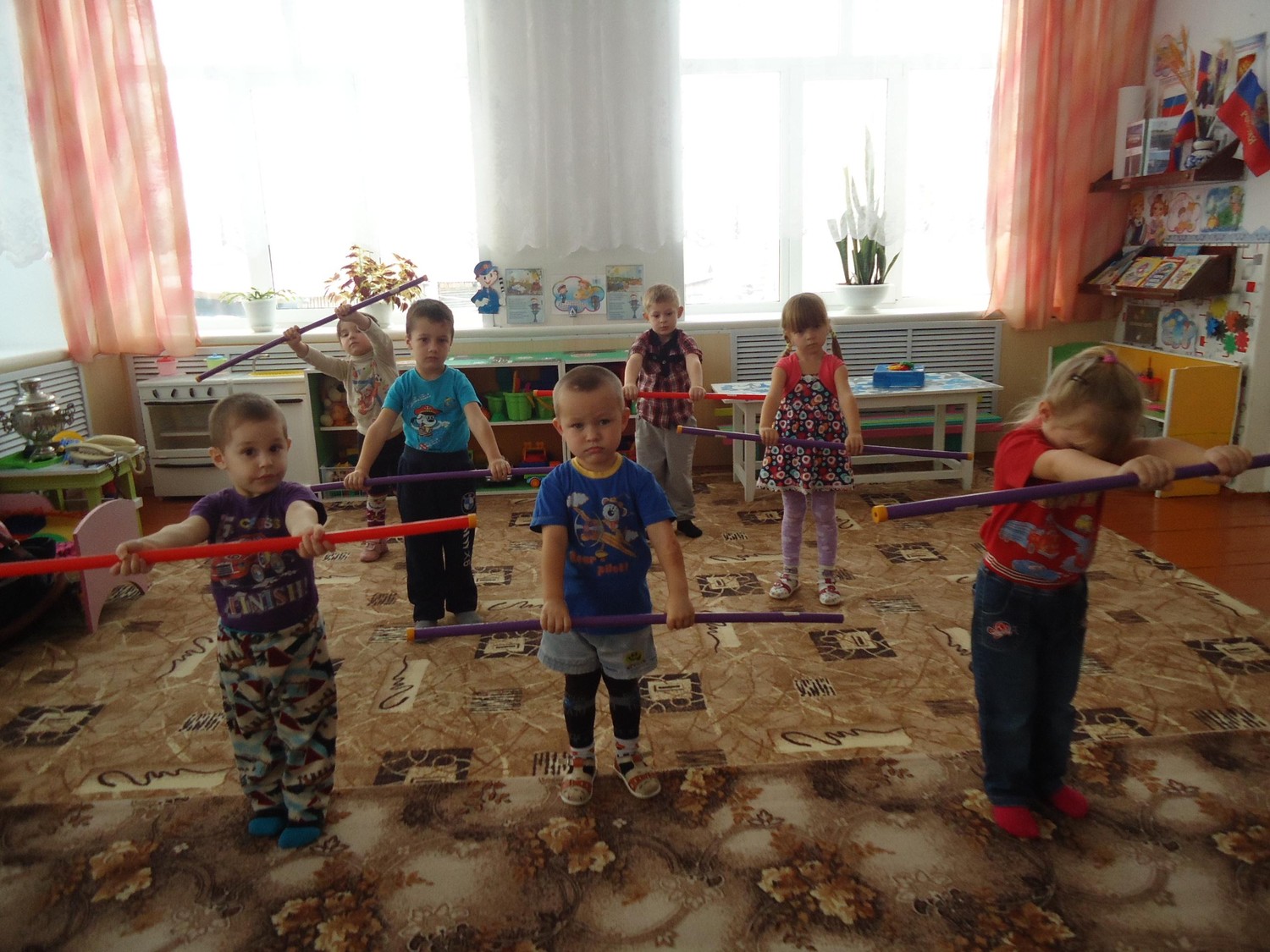 Описание: Дети стоят в кругу лицом в центр. Воспитатель берет обручи и на слово "раз!" подает обруч ребенку справа, а на - "два" - ребенку слева. Дети берут обручи за свободные места и, поворачивая туловище, переносят обручи на вытянутые руки вперед, в другую сторону, передают его дальше. Ребенок, у которого окажутся два обруча, выходит на середину и выполняет разные движения с обручами. На слова воспитателя:"Толя, в круг вставай, обручи передавай!" Толя встает, где хочет и на обговоренный сигнал "раз" передает один обруч в правую сторону, на сигнал "два" передает обруч в левую сторону. Игра повторяется 3 - 4 раза.